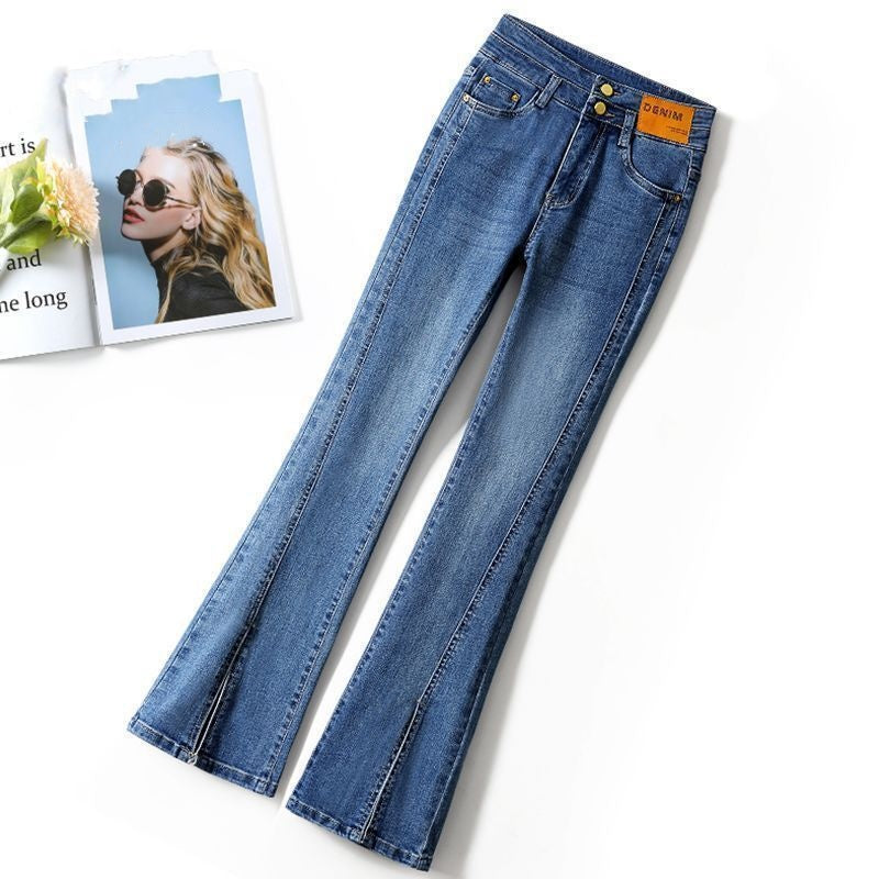 Package Include: 1* High-Waisted Flared Denim Jeans with Split Hem
