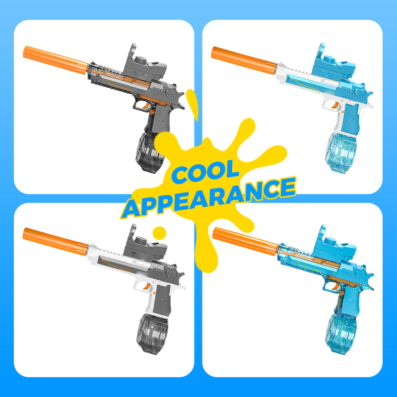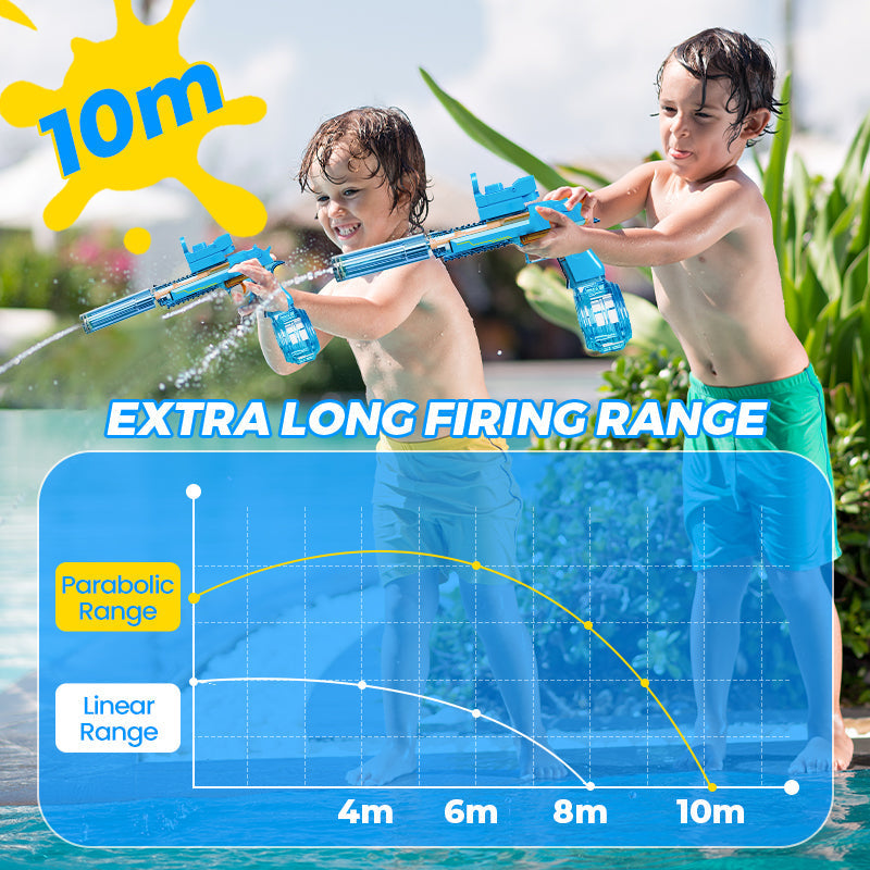 TIRO A LUNGA DISTANZA: Grazie al suo potente sistema di propulsione ad acqua, può sparare acqua fino a 10 metri. Questa gittata impressionante garantisce agli utenti di ingaggiare i bersagli da una distanza di sicurezza, offrendo loro un vantaggio tattico nei combattimenti in acqua.