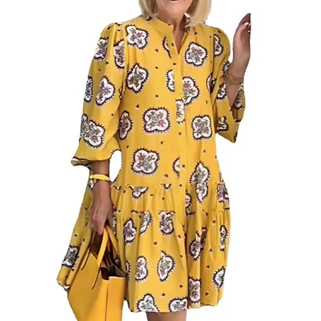 Dresses Type: Print Dress, Summer Dress Neckline: Split NeckFabric: PolyesterDesign: Print, Button,Ruffle