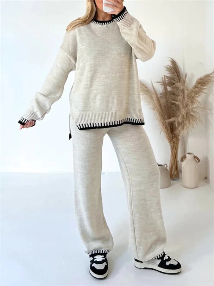 This two-piece ensemble features a rib-knit sweater and matching high-waisted pants, both adorned with stylish stripe detailing at the hems.