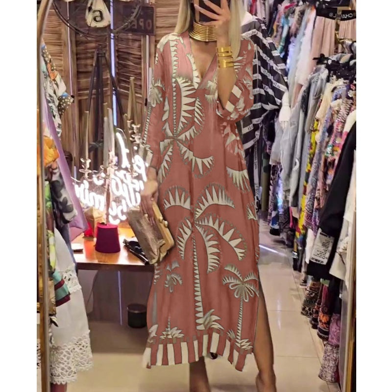🌷Limited Time 48% OFF💞Women's Vintage Coconut Tree Print Dress with 3/4 Sleeve & Split Hem